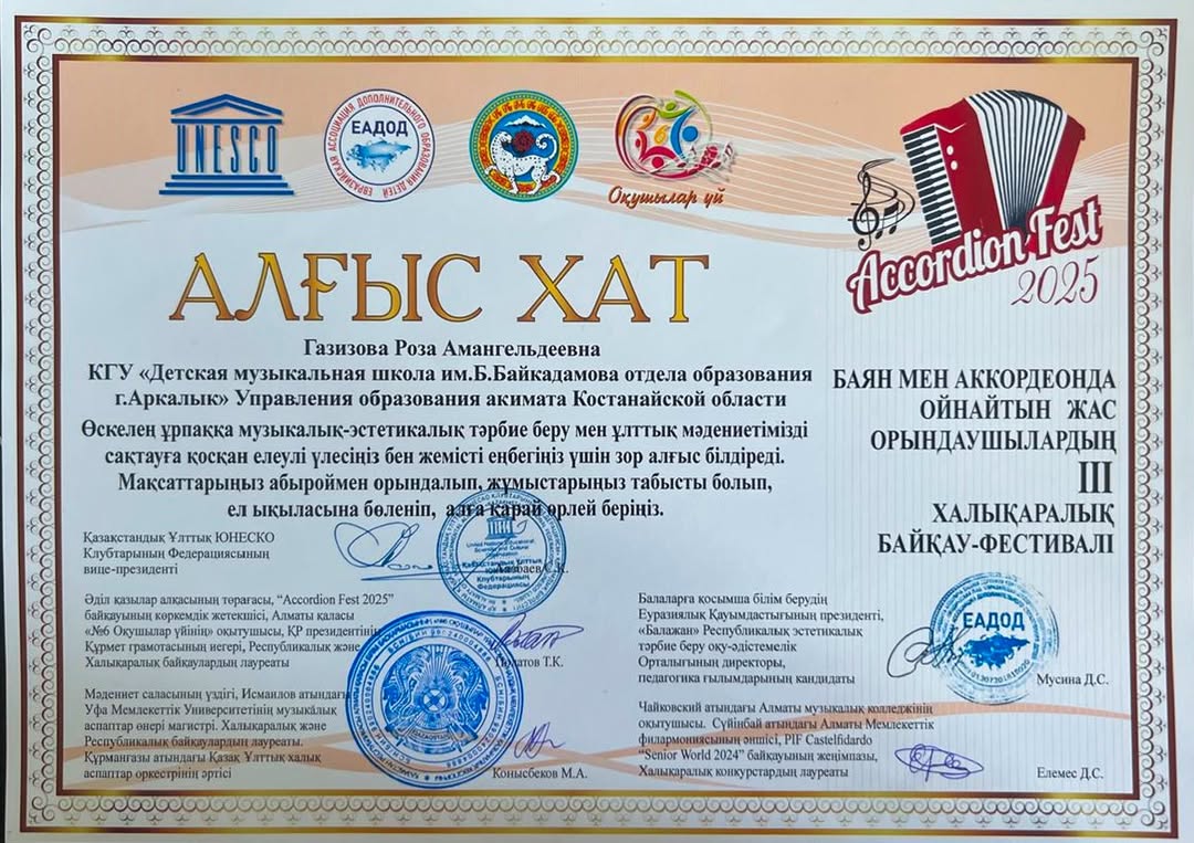 Халықаралық «Accordion fest» байқауына қатысқаны үшін Б.Байқадамов атындағы балалар музыка мектебінің мақтанышы, мектебіміздің дарынды оқушысы Ақышев Асанали марапатталды.