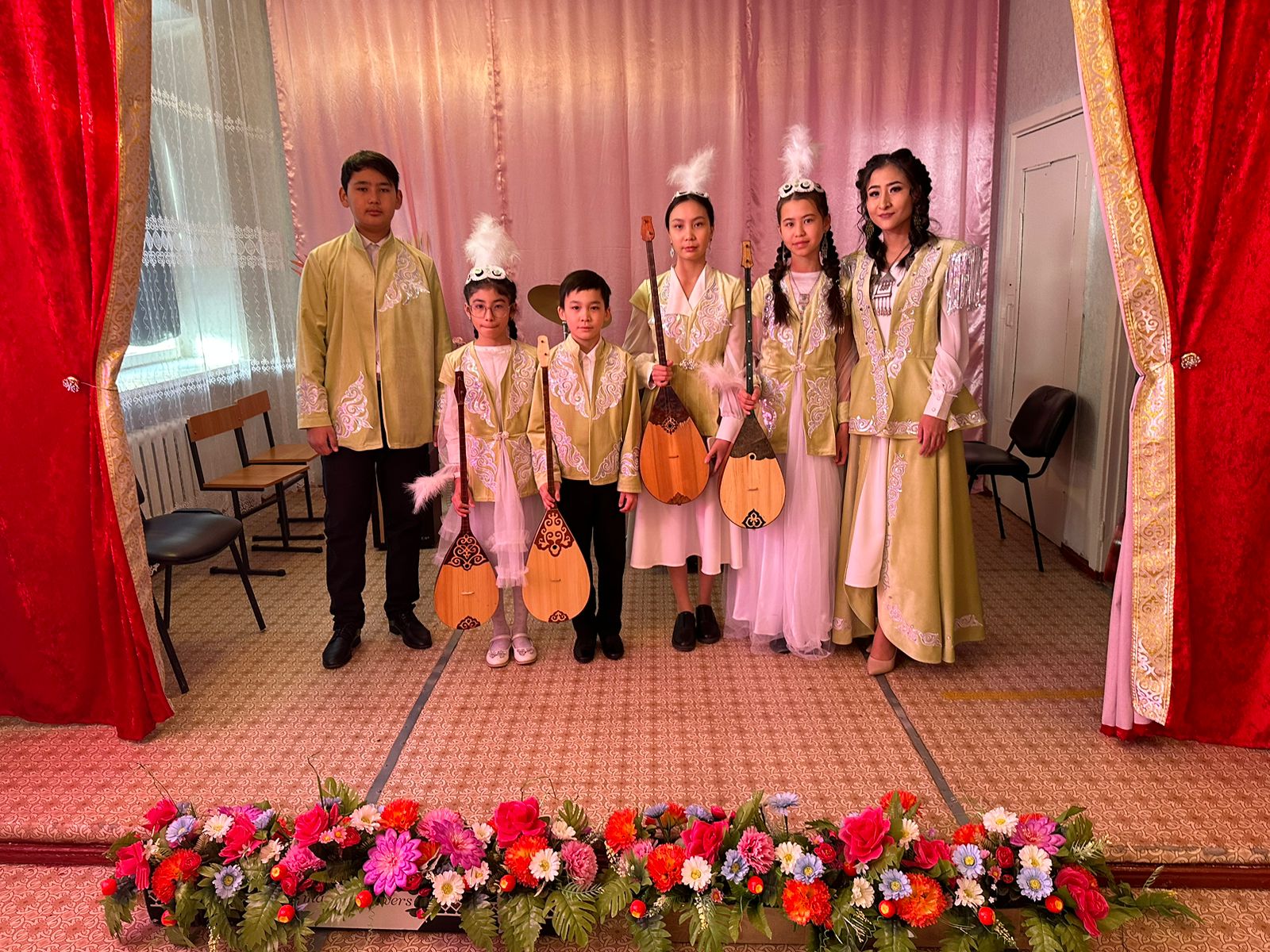 Үндестік жобасы аясында “Құлақтан кіріп, бойды алар, әсем ән мен тәтті күй”атты домбыра сыныбының мұғалімдері Қапан Олжас Мүшелбайұлы мен Карибаева Асель Мейрамовнаның ұйымдастыруымен дәстүрлі ән шырқалып, күмбірлеген күй тыңдалған, өсіп келе жатқан жас та талантты оқушылардың сыныптық концерті болып өтті.Дәстүрлі ән бойынша Сардар Айару мен мұғалімі Қапан Олжастың орындауындағы халық әні «Беу-айдай» әнімен бастау алған концертіміз, оқушыларымыз Айдар Балқадиша, Мұхтар Айкөркем, Өмірбай Аяулым, Қазыкен Жанерке мұғалімдері Асель Мейрамовнамен орындауындағы халық күйі «Нар агачи» күйімен жалғасын тапты.Өнерлі өрендер Максим Маржан, Нұралы Жансұр «Құр ойнақ: күйін күмбірлете ойнады.Айтбай Айзада, Шакиржанова Айару мұғалімі Олжас Мүшелбайұлымен бірге халық күйі «Тепең көкті» нақышына келтіре орындап берді.Талантты ұлдарымыз Жұмабай Әбубәкір, Нұралы Жансұр, Тюрякин Жандаулет халық күйі «Салкүрең» күйін орындап, көрермен қошеметіне бөленді.Өнерлі аруымыз Елеусізова Жансая А.Мұздаханов ағамыздың «Тархан баба» күйін қоңыр домбырасымен күмбірлетті.Абдулхамит Райымбергеновтің «Секіртпе» туындысын бір топ өнерлі жастарымыз Нұралы Жансұр, Қойшыбай Каусар, Тюрякин Жандаулет, Максим Маржан, Елеусізова Жансаямен бірге мұғалімі Асель Мейрамовнамен қазақы киімдерімен күйді нақышына келтіріп орындады.Сыныптық концерттің соңы мектебіміздегі класс мұғалімдерінің “Ақжелең” күйін орындаумен тәмамдалды.Концерттің соңыңда мектеп басшысы Ж.И.Бултирикова мен ата-аналар сөз сөйлеп,жылы лебіз тілек,алғыстарын айтып,арнайы класс мұғалімдеріне дайындаған гүл шоқтарын тарту етті.Бабадан қалған есті ән, әсерлі күй әрқашан атадан балаға мол мұра боп қала бермек. Сол рухани мирасты әр оқушының санасына сіңіріп, жадына жаттату бізге парыз!