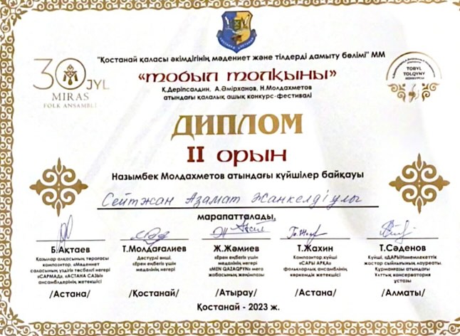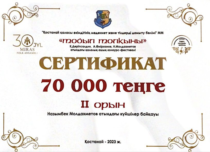 “Мирас»”Қостанай қалалық мәдениет сарайының, «Мирас» қазақ халық аспаптар ансамблінің 30 жылдығын және ҚР Еңбек сіңірген мәдениет қайраткері, ҚР Композиторлар Одағының мүшесі, әнші-композитор Қалибек Дерипсалдиннің туғанына 70 жыл толуын мерекелеу шеңберінде Қазақстан Республикасының Тәуелсіздік Күніне орай «Тобыл толқыны» атты облыстық ашық қалалық байқау-фестивалінде 2 ші бағыты бойынша Назымбек Молдахметов атындағы жеке домбырашылар конкурсында домбыра аспабының мұғалімі Сейтжан Азамат Жанкелдіұлы жүлделі 2-орын және ақшалай 70000 тг сертификат алды. Құттықтаймыз!Жас өрендеріміздің шығар шыңдары биік болсын!Бүгінгі облыстық байқаудан алған қос жүлдеміз жеңісіміз құтты болсын!💐