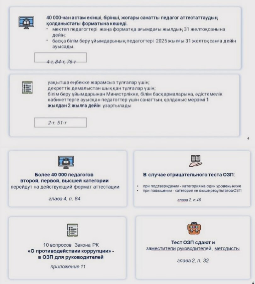 ҚР-ның Білім және ғылым министрінің 2016 жылғы 27 қаңтардағы №83 бұйрығына сәйкес Педагогтарды аттестаттаудан өткізу қағидалары мен шарттары бойынша жалпы ережелерін түсіндіру бойынша ,ҚББҰ-ның педагогтары ережені талқылап ғана қоймай,түсіндіру жұмысы барысында төмендегі сұрақтарды қойды. 1)Егер жас маман 2 жыл еңбек өтілі бар болса,1 тарау бойынша міндетті түрде ҚББҰ-ның мұғалімі болсада,ағылшын тілін білетіндігін растайтын сертификаты мен магистр академиялық дәрежесі бар дипломы болу міндеттіме? 2)Мен 2020 жылы сәуір айында ескіше екінші санатты алдым,ал менің қазіргі таңда 9 жыл еңбек өтілімім бар сонда мен келесі санат қайсыған беремін педагог-модератордан бастаймынба?әлде педагог-эспертке тапсырсам болама? 3)В 2022-2023 я перевелась из ТИПО в организацию ДО, хочу знать какую категорию могу защищать в данное время с общим пед.стажем в 23 года? 4)Мен 2021 жылы педагог-модератор санатын алдым,қазіргі таңда алғаныма 2 жыл болды соңда мен мерзімінен бұрын өткен жағдайда педагог-эксперт емес,педагог-зерттеушіге тапсыра аламынба? 5)Зейнет жасына шығуыма 2 жыл қалды,жалпы еңбек өтілімім 37 жыл 11 ай,ереженің 4 тарауы бойынша 30 жылдан көп жыл педагогикалық еңбек өтілі бар педагогтар тесттан босатылады деген.Бірақ менің портфолиам педагог-зерттеуші біліктілік санатының талаптарына сай келіп тұрса,онда мен автоматты түрде педагог-модератор санатын алмай,педагог-зерттеушіні тест тапсырып ала аламынба? 6)ЖОО-ның бітіргеннен кейін мен жұмысқа тұру үшін конкурс бойынша тест тапсырамын,ал егерде менде 5 жылдан кем емес жұмыс өтілім болса педагог-модератор санаты беріледә деген 3 ші тарау бойынша.Сонда мен екі рет тест тапсыруым керекпа?