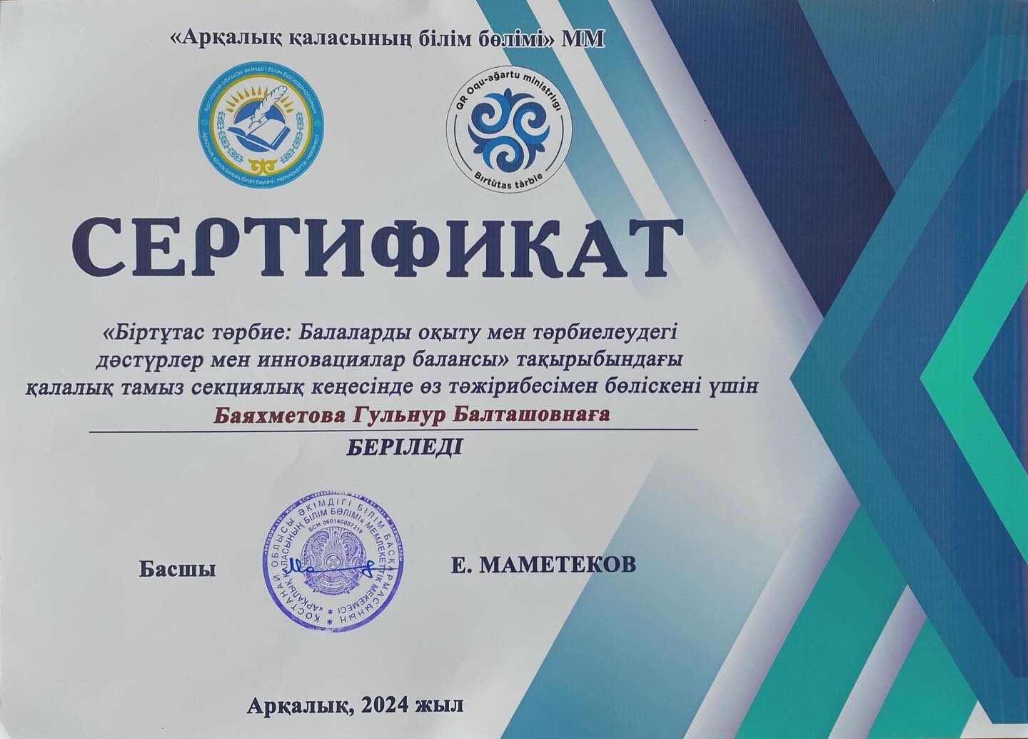 «Біртұтас тәрбие: Балаларды оқыту мен тәрбиелеудегі дәстүрлер мен инновациялар балансы» тақырыбындағы қалалық тамыз секциялық кеңесінде өз тәжірибесімен бөлісіп, шеберлік сағатын қалалық деңгейде өткізгені үшін мектебіміздің вокал бөлімінің ұстазы Баяхметова Гульнур Балташовна Арқалық қаласы білім бөлімі басшысы Е. Маметековтен арнайы сертификатпен марапатталды.