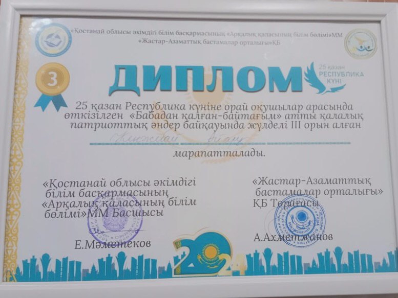 24 қазан күні Арқалық қаласы Ә.Боранбаев атындағы кинотеатрында «Жастар-Азаматтық бастамалар орталығы» қоғамдық бірлестігінің ұйымдастыруымен 25 қазан Республика күніне орай өткізілген «Бабадан қалған-байтағым» атты қалалық оқушылар арасындағы патриоттық әндер байқауында вокал бөлімінің оқушылары Дәулет Айару 1 орын алып, арнайы «Арқалық қаласы білім бөлімі» ММ басшысының және «Жастар-Азаматтық бастамалар орталығы ҚБ» төрағасының дипломы мен 30 000 теңге сертификатына ие болды. Ал Кенжебай Айару 3 орын және 10 000 теңге сертификатын иеленді. Жүлделі орындарымен шын жүректен құттықтай отырып, әнші қыздарымызға алдағы үлкен байқауларда тек шығармашылық шабыт тілейміз! Жетекшісі — вокал бөлімінің мұғалімі Баяхметова Гүлнұр Балташовна.