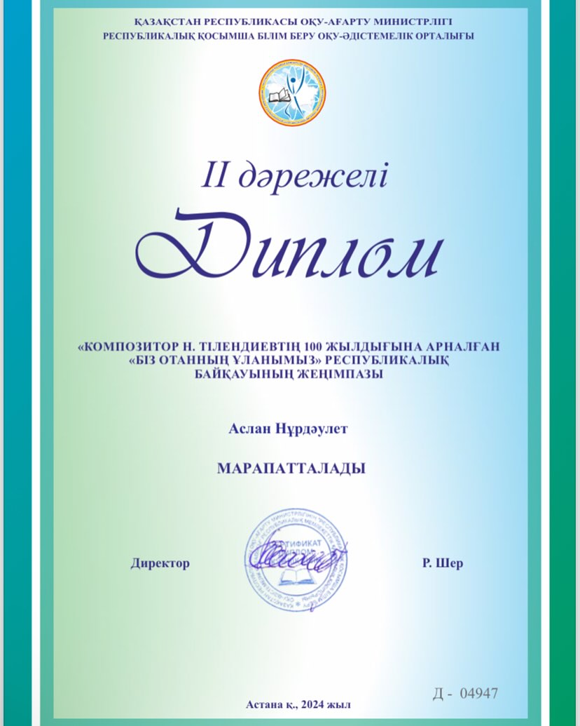 Композитор Н. Тілендиевтің 100 жылдығына арналған «Біз Отанның ұланымыз» республикалық байқауының жеңімпаздарын жоғары деңгейде дайындап, олардың дәстүрлі күй және ән өнеріне деген қызығушылығын арттырып, ұлттық құндылықтың дәріптелуіне қосқан үлестері үшін мектебіміздің мұғалімдері Жусупова Балым Сейітхановна мен Сембіғұл Назира Әділханқызы Алғыс хатпен марапатталды! Сонымен қатар, оқушыларымызды жүлделі орындарымен құттықтаймыз! Сіздерді шын жүректен құттықтай отырып, шығармашылық толағай табыстар тілейміз!