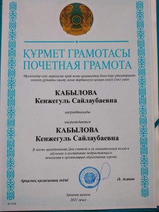 Қазан айының алғашқы мерекесі Ұстаздар күніне орай білім беру саласына аянбай еңбек етіп жүрген бірқатар мұғалімдер марапатталды. Соның қатарында, Б.Байқадамов атындағы балалар музыка мектебінің оқытушысы Кабылова Кенжегуль Сайлаубаевна қала әкімі қолынан "Құрмет" грамотасын алса, өскелең ұрпаққа сапалы білім, саналы тәрбие беру ісіндегі жоғары шеберлігі мен белсенділігі үшін әріптесіміз Қабден Қырмызы Меңдібайқызы Арқалық қаласы білім бөлімі басшысының мадақтама грамотасымен марапатталды.